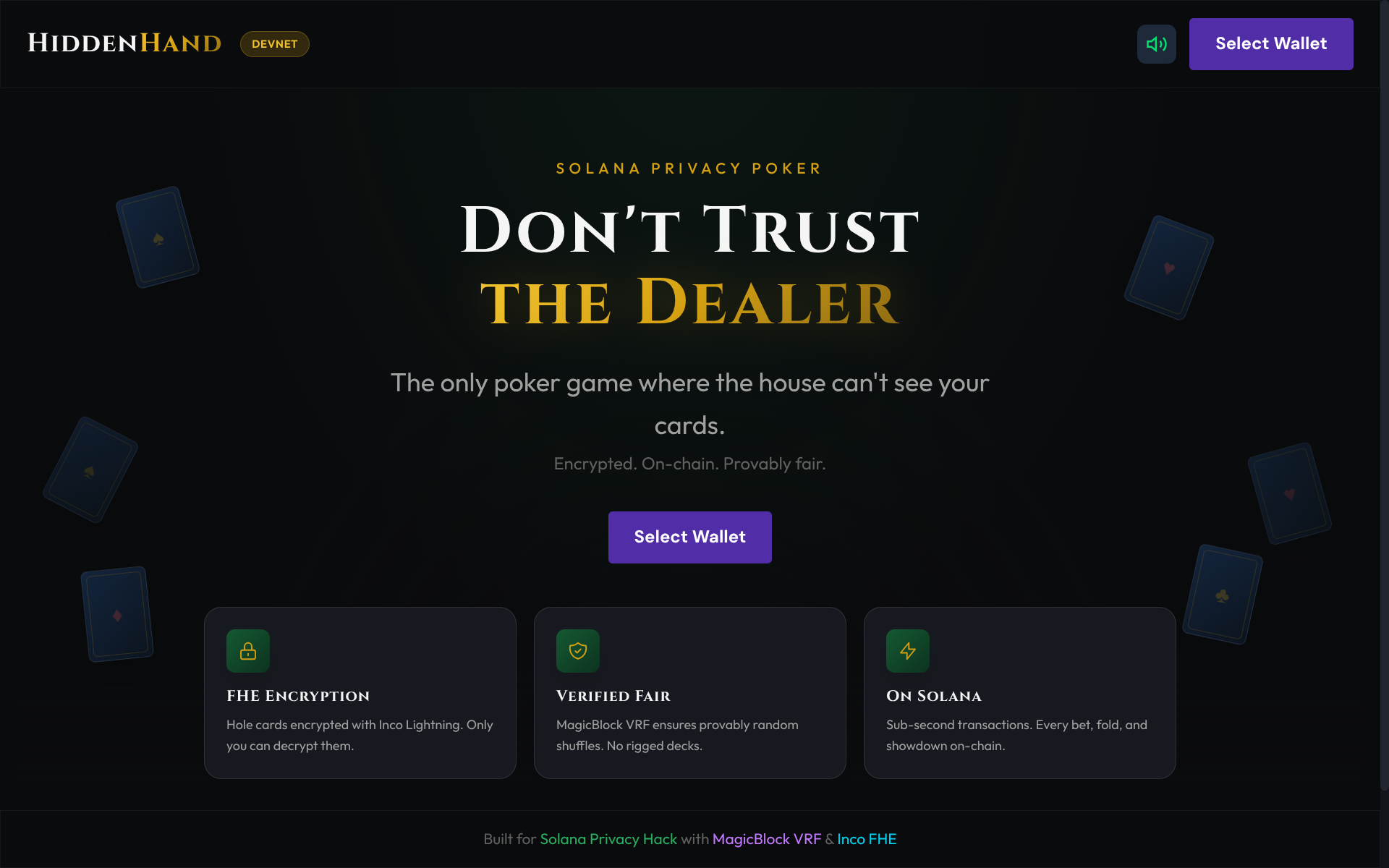 Fully on-chain Texas Hold'em with cryptographic privacy. Provably fair shuffling, FHE-encrypted cards, and verified reveals — no one can see your cards, not even the platform.